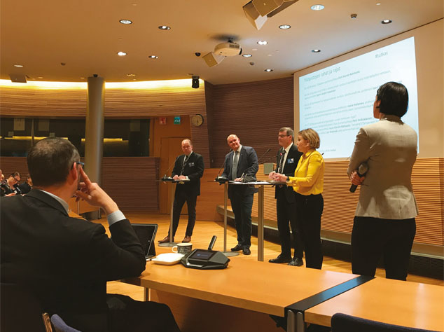 Puheenjohtajat Petri Koikkalainen Tieteentekijöiden liitosta ja Jouni Kivistö-Rahnasto Professoriliitosta olivat Helsingin yliopiston rehtori Jari Niemelän ja kansanedustaja Pilvi Torstin (sd) kanssa keskustelemassa yliopistojen tehtävien rajoista.