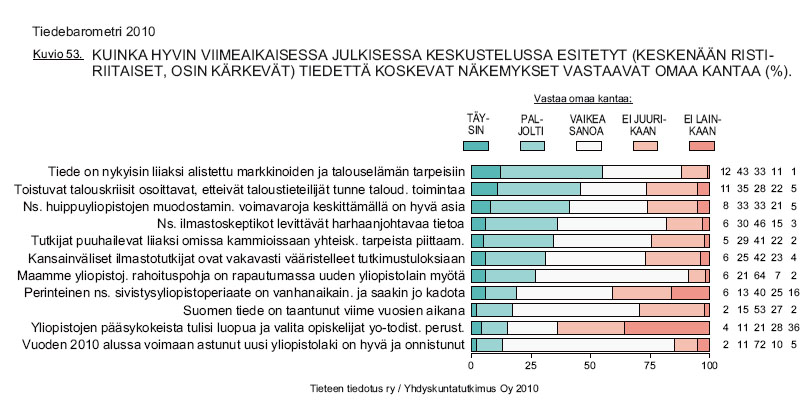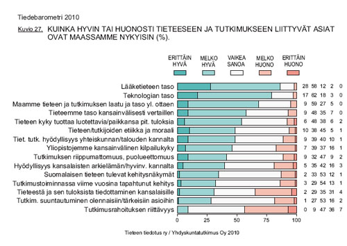 Kansa haluaa panostusta tieteeseenVain 9 prosenttia kansalaisista pitää nykyistä tutkimusrahoitustamme riittävänä. Tämä on vahva viesti päättäjille eduskuntavaalien alla. Uusimmassa Tiedebarometrissä kansalaiset antavat selvän tuen sivistysyliopistolle. Yli puolet barometriin vastaajista katsoo, että tiede on liiaksi alistettu markkinoiden ja talouselämän tarpeisiin. Tiede sekä instituutiona että nimettyinä organisaatioina nauttii suomalaisten suurta luottamusta. Maamme tieteen ja tutkimuksen tasoa pidetään hyvänä. Tiedot ilmenevät Tiedebarometri 2010 - tutkimuksesta, jossa selvitetään suomalaisten suhtautumista tieteeseen ja tieteellis-tekniseen kehitykseen. Tutkimuksen kirjalliseen kyselyyn vastasi 1031 henkilöä. Tiedettä ja tutkimusta koskevat instituutiot tai organisaatiot nauttivat suomalaisten suurta luottamusta. Tiedeorganisaatioista korkeimmalle kipuavat yliopistot, jotka saavat osakseen lähes yhtä paljon luottamusta kuin puolustusvoimat. Viime mainitun ohi vertailussa menee ainoastaan poliisi. Instituutioiden rankingissa ammattiyhdistys liike sijoittuu keskikastiin, ja luottamus siihen on kasvanut verrattuna edelliseen, vuoden 2007, barometriin. Tiedebarometri 2010 on vuonna 2001 käynnistetyn tutkimussarjan neljäs osa. Veronmaksajilta selvä viesti Kansalaisilta tiedusteltiin myös sitä, millaisella tolalla erilaiset tieteeseen ja tutkimukseen liittyvät asiat ovat heidän mielestään maassamme tällä hetkellä (ks. kuvio). Vastauksissa tunnustusta annettiin koko tiedeyhteisölle. Maamme tieteen ja tutkimuksen taso nähdään hyväksi: kaksi kolmesta antaa sille hyvän yleisarvosanan ja vain harva (5 %) huonon. Lähes kuusi kymmenestä (57 %) katsoo tieteemme tason hyväksi myös kansainvälisesti vertaillen.