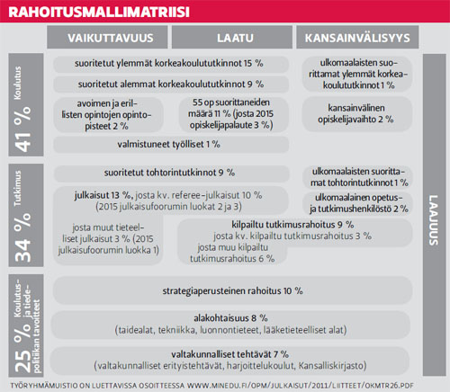 Rahoitusmalli siirtää fokuksen tavoitteista tuloksiinTutkintotavoitteet eivät enää vuodesta 2013 lähtien määrittele yliopistojen rahoitusta. Jatkossa niiden rahoitus määräytyy pitkälti tutkintomäärien ja julkaisujen perusteella. Maisteritutkinto on yliopistojen perustutkinto, joten sen painoarvo on suurempi kuin alempien tutkintojen. Mallin koulutusosiossa on mittareita, joilla tähdätään opintojen vauhdittamiseen: 55 opintopistettä suorittaneiden määrä on rahoituskriteeri. Opiskelijapalaute aiotaan ottaa mukaan vuodesta 2015, kun YOPALA-palautejärjestelmä valmistuu. Valmistuneiden laadullinen työllistyminen on mukana prosentin osuudella. Yhden prosentin painoarvo mallissa on kuitenkin aika suuri, 15—20 miljoonaa euroa. Tieteellisten seurain valtuuskunta on toteuttanut opetus- ja kulttuuriministeriön rahoituksella Julkaisufoorumi-hanketta, jonka tavoitteena on luoda laatuluokitus tieteellisen julkaisemisen kanaville. Luokitus valmistuu tämän vuoden loppuun mennessä. Sitä ei voida hyödyntää vielä seuraavan rahoituskauden alussa, mutta se aiotaan ottaa käyttöön 2015. Kansainvälistyminen huomioidaan mallissa selvästi aiempaa vahvemmin. Ulkomaalaisten suorittamien tutkintojen ja opiskelijaliikkuvuuden ohella rahoitusmallissa on kriteerinä ulkomaalaisen opetus- ja tutkimushenkilöstön määrä. (ks. pääkirjoitus.) Korkeakoulujen ja tiedelaitosten johdon seminaarissa 21.11. rahoitusmallia esittelyt johtaja Anita Lehikoinen opetus- ja kulttuuriministeriöstä kertoi olleensa hieman yllättynyt siitä, että monet tahot halusivat uuteenkin malliin strategiarahaa. Sillä aiotaan ohjata mm. yliopistojen profiloitumista. Rahoitusmalli on verkkopohjaisella lausuntokierroksella viikoilla 47— 50. Valmiiksi se aiotaan saada ensi vuoden alussa. Mallia seminaarissa kommentoinut Suomen yliopistot UNIFIn puheenjohtaja, Oulun yliopiston rehtori Lauri Lajunen ei oikein löytänyt siitä moitteen sijaa. Työryhmässä olikin vahva yliopistojohdon edustus. — Mallia suurempi huoli on se, mikä on kehys ja kuinka paljon on jaettavaa, Lajunen totesi ja toivoi, että opetusministeri pitää puolensa kehysratkaisuissa. SYL:n puheenjohtaja Katri Korolainen-Virkajärvi piti rahoitusmallin valmistelua hieman paavillisena ja kyseenalaisti valmisteluprosessin demokraattisuutta. 55 opintopisteen suorittaneiden ottamisessa laatukriteeriksi hän näki valtiovarainministeriön vaateet. — Toivottavasti tämä ei tee yliopistoista banaanivaltioita eikä johda riman laskuun ja tutkintotehtailuun, hän tähdensi. Kirsti Sintonen