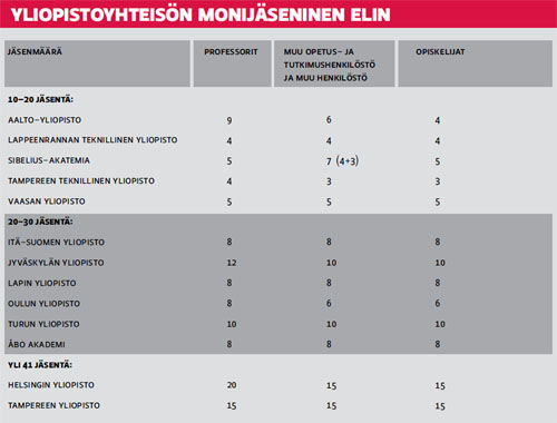 Yliopistokollegion asemaan toivotaan kirkastustaYliopistokollegioiden lakisääteiset tehtävät ovat samat, mutta koostumukset, toimintamallit ja painotukset vaihtelevat paljonkin. Kollegioille toivotaan lisää valtaa paikkaamaan yliopistojen demokratiavajetta. Acatiimi-lehteen on otettu yhteyttä ja toivottu juttua yliopistokollegioiden asemasta. Sen roolissa koetaan olevan epäselvyyttä. Lähetimme kyselyn kaikkien kollegioiden puheenjohtajille ja tiedustelimme tilanteesta. Vastauksia tuli 11. Monet vastaajista toivoo, että kollegion asemaa kirkastetaan, jos ja kun yliopistolakia avataan. Hyväksyessään yliopistolain eduskunta edellytti, että opetusministeriö tekee kevään 2012 loppuun mennessä selvityksen yliopistolain vaikutuksista. Ministeriö teettää tämän konsulttityönä ja Gaia Consultingin raportin pitäisi valmistua ensi maaliskuussa. Vaikutusten arviointi toteutetaan kyselykaavakkeiden ja haastattelujen avulla. Lomakekyselyt lähetään muun muassa hallitusten ja yliopistojen monijäsenisten elinten jäsenille sekä otoksella henkilöstölle. Rehtorit ja yliopistopolitiikan päättäjät haastatellaan erikseen. Iso arviointifoorumi on tarkoitus järjestää helmikuussa. Pari kokousta per vuosi Julkisoikeudellisten yliopistojen kollegioiden koot vaihtelevat suuresti. Laissa määritellään vain enimmäismäärä 50 jäsentä. Tämä on Helsingin yliopistolla. Muissa yliopistoissa jäseniä on 12—45. (Ks. oheinen taulukko.) Yliopistokollegiot kokoontuvat hyvin eri tahdissa: 1—5 kertaa vuodessa. Lappeenrannan teknillisessä yliopistossa kokoontumisia on ollut vain kerran vuodessa tilinpäätöksen vahvistamisen ja vastuuvapauden myöntämisen yhteydessä. Helsingin yliopiston kollegio on ollut koolla noin viisi kertaa vuodessa. Yleisin malli näyttää olevan kaksi kokousta per vuosi eli yksi loppukeväästä ja toinen loppuvuodesta. Näin kuvaa esimerkiksi Hankenin kollegion puheenjohtaja, professori Christian Grönroos: — Under höstterminen: ett informations- och diskussionsmöte då rektor och styrelseordföranden informerar om aktuella strategiska frågor ur styrelsens och den operativa ledningens (rektors) perspektiv. UK kan diskutera frågor som kommer upp och också ta upp andra saker som man önskar informera rektor och styrelsen om att man anser vara viktiga för högskolans strategiska utveckling och ledning. Detta är dock inte ett beslutsmöte. Och under vårterminen: beslutsmötet där bokslutet fastställs och det besluts om ansvarsfrihet för rektor och styrelse. Därutöver kan UK ta upp ärenden som det anser vara viktigt för högskolans strategiska ledning. Beslut i sådana saker som skulle binda styrelse eller den operativa ledningen fattas dock inte. Joukkueenjohtaja ja yhteydenpitäjä Hyvin monissa yliopistoissa on muodostunut käytäntöjä hallituksen ja kollegion väliselle yhteistyölle. Jyväskylässä pidetään yksi yhteiskokous. Aika monissa yliopistoissa hallituksen puheenjohtaja ja rehtori pitävät ajankohtaiskatsauksia kollegion kokouksissa. Lisäksi hallitusten ja kollegioiden puheenjohtajat voivat tavata säännöllisesti toisiaan. Sibelius-Akatemiassa tapaamisissa on myös kollegion varapuheenjohtaja. Vain Tampereen yliopiston ja Lappeenrannan teknillisen yliopiston (LTY) kollegioiden puheenjohtajilla on läsnäolo-oikeus hallitusten kokouksissa. Kollegion puheenjohtajat kuvaavat omia roolejaan asioiden valmistelijaksi, yhteydenpitäjäksi, keskustelun mahdollistajaksi. — Olen yliopistoyhteisön ’joukkueenjohtaja’. Tarvittaessa toimin myös äänitorvena yliopistonjohdon ja hallituksen suuntaan, kuvaa rooliaan Turun yliopiston kollegion puheenjohtaja, professori Eija Suomela-Salmi. — Lyhyestä aikajänteestä johtuen mitään erityistä roolia ei ole ehtinyt kehittyä, mutta pidän tärkeänä akateemisen näkökulman esilletuloa yliopiston johtamisessa. Tässä mielessä pyrkimykset laajaan ja perusteelliseen keskusteluun ovat mielestäni toivottavia, Vaasan yliopiston kollegion puheenjohtaja, professori Martti Laaksonen toteaa. — Puheenjohtaja on ohjaaja ja aktiivinen reagoija, vaikka paljon asioissa mennäänkin hallintokeskuksen ehdoilla, Jyväskylän yliopiston kollegion puheenjohtaja, professori Petri Karonen sanoo. Moukari on, mutta ei talttaa Tiedustelimme puheenjohtajilta, onko kollegiolla nyt sopivasti valtaa vai pitäisikö sitä olla enemmän. Suurin osa vastasi, että valtaa voisi olla lisää. — Kollegiolla voisi olla enemmän valtaa. Esimeriksi talousarvion hyväksyntä olisi hyvä tehdä kollegiossa, koska se vahvistaa myös tilinpäätöksen, kommentoi Helsingin yliopiston kollegion puheenjohtaja, akatemiaprofessori Markku Kulmala. — Enempi valta ei olisi pahitteeksi. Kollegio voisi ottaa kantaa hallituksen jäsenten toimintaan. Nyt siihen voidaan puuttua vain jos on tapahtunut rötöksiä, puheenjohtaja, professori Kyösti Kurtakko Lapin yliopistosta huomauttaa. Myös Oulun yliopiston kollegion puheenjohtaja, yliopistonlehtori Juha Jaako toivoo lisää valtaa hallitusten jäsenten erottamisessa. — Jos ulkopuolinen jäsen osallistuu vain 35 prosenttiin hallituksen kokouksista, sellainen jäsen pitäisi pystyä vaihtamaan, Jaako katsoo. — Kollegiolla on valtaa riittävästi, mutta se on osaksi vääränlaista. Sillä on käytössään moukari eli se päättää vastuuvapauden myöntämisestä hallituksen jäsenille ja rehtorille, mutta ei talttaa eikä vasaraa pienempien ongelmien käsittelyyn, hän lisää. Nykyistä tilannetta pitivät vallankäytön osalta melko selkeänä ainoastaan Christian Grönroos Hankenilta ja Sibelius-Akatemian kollegion puheenjohtaja, professori Martti Rousi. Yliopistoyhteisön äänitorvi Monissa vastauksissa tuli esille se, että kollegio katsoo edustavansa yliopistoyhteisön ääntä, jonka soisi kuuluvan nyky-yliopistoissa enemmän. Yliopistolain myötä yliopistoista hävisi kollegiaalisia hallintoelimiä. Nyt näiden piirteitä halutaan takaisin. Helsi