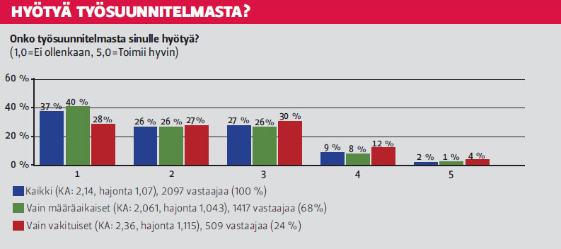 Toimistotyöaika sai vain vähän kannatusta Asteikolla 1-5, 59 prosenttia vastanneista katsoi kokonaistyöaikajärjestelmän toimivan melko hyvin tai hyvin (4-5). Isoja eroja eri nimikkeillä työskentelevien osalta ei ollut. Vain 14 prosenttia vastanneista siirtyisi mieluummin säännöllisen toimistotyöajan piiriin. 16 prosenttia vastanneista ei ole tehnyt ollenkaan työsuunnitelmaa. Helsingin, Oulun, Lapin ja Turun yliopistoissa noin 20 prosenttia vastanneista ei ollut laatinut työsuunnitelmaa. Sen tehneistä 37 prosenttia katsoi, ettei työsuunnitelmasta ole ollut lainkaan hyötyä. Avovastausten perusteella työsuunnitelmia pidettiin turhauttavina, koska niillä ei ole paljoakaan tekemistä todellisten töiden ja työmäärän kanssa. Erityisen turhauttavana pidettiin työajan kohdentamista, koska todellinen tehty työmäärä on huomattavasti suurempi kuin 1 600 tuntia. Kokonaistyöaikaa koskevan työehtosopimuksen mukaan jokaisen henkilön on laadittava työsuunnitelma yhteistyössä esimiehensä kanssa ennen seuraavan lukuvuoden alkua. Kyselyn perusteella näyttää myös siltä, että työsuunnitelmia ei ole muutettu perhevapaiden ja sairauspoissaolojen vuoksi. 80 prosenttia vastaajista on voinut pitää vuosilomaa vastaavan vapaan. Väitöskirjantekijöiltä kysyttiin erikseen opetustehtävien määrää. Vastausten perusteella monella menee vuosittaisesta työajasta enemmän aikaa opetustehtäviin kuin työehtosopimuksen suosituksen mukainen 5 prosenttia. Perhevapaiden pitämisessä ongelmia Pääosin kokonaistyöaikajärjestelmään ollaan tyytyväisiä. Liian suuret työmäärät johtuvat liian vähäisestä opetus- ja tutkimushenkilöstön määrästä eikä työaikajärjestelyistä. Lyhyissä määräaikaisissa palvelussuhteissa olevilla vuosilomaa vastaavat vapaat jäävät usein pitämättä tai osittain pitämättä. Perhevapaiden yhteydessä pitäisi voida tarkastella työsuunnitelman toteutumista ennen perhevapaan alkua ja perhevapaan jälkeen. Jos vapaajaksoa ei ole ehtinyt pitää ennen perhevapaan alkamista, on luontevaa neuvotella vapaajakson sijoittumisesta perhevapaan jälkeen. Tässä asiassa tarvitaan myönteistä ilmapiiriä ja tietoisuuden lisäämistä. Määräaikaisissa palvelussuhteissa olevat eivät välttämättä uskalla ottaa esille työsuunnitelmaansa liittyviä asioita esimiehensä kanssa, kun pelkäävät työsuhteensa jatkumisen puolesta. Yliopistojen henkilöstöosastojen tulisi ohjeistaa ja kouluttaa esimiehiä perhevapaiden huomioon ottamisesta kokonaistyöaikajärjestelmässä. Ongelmien ratkaisemiseksi on neuvoteltava myös mahdollisista tarkennuksista työehtosopimuksen soveltamiseen. Työsuunnitelmien tekemiseen ja merkitykseen on syytä kiinnittää enemmän huomiota. Työsuunnitelma on kuitenkin dokumentti, joka voidaan ottaa esille esimerkiksi erimielisyystilanteissa ja tarkasteltaessa suunnitelman toteutumista. Työsuunnitelmia käytetään myös tilastoinnin pohjana, kun tarkastellaan, kuinka paljon yliopistossa käytetään aikaa opetustehtäviin, tutkimustehtäviin ja yhteiskunnalliseen vaikuttamiseen. teksti Eeva Rantala Poimintoja avovastauksista”Älkää nyt tätäkin ruvetko herran jestas muuttamaan.” ”Mitä järkeä on ylläpitää kokonaistyöaikajärjestelmää, kun kukaan ei tee VAIN 1600 tuntia töitä vuodessa. Kokeilepa tehdä, niin seuraavana vuonna ei enää sulle töitä löydykään!” ”Antaa paljon vapautta järjestellä omia työtehtäviä ja työaikoja sopivalla tavalla. Ainoa ongelma on todellisen työmäärän ja teoreettisen työmäärän vastaamattomuus.” ”Kokonaistyöaika on periaatteessa hyvä, mutta yliopistojen toiminta perustuu liian paljon siihen, että tutkimustyö tehdään työajan ulkopuolella.” ”Ongelma lyhyissä pätkätyösuhteissa. Ollaan projektin johtajan armoilla siinä, onko lomaa mahdollista koskaan pitää.” ”Lomat ja perhevapaat epäselviä! Äitiysloman ajalta tulee ”kertyä” vapaata niin kuin vanhassa systeemissä! Tilanne on siis huonontunut selvästi.”