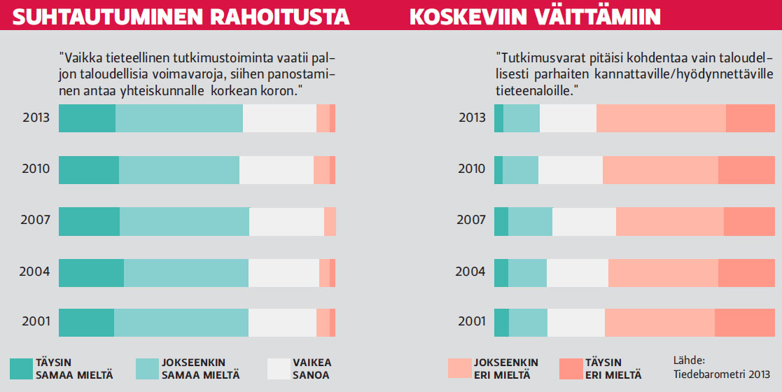 Kansa luottaa tieteeseen ja sen tekijöihinUusimman Tiedebarometrin mukaan tiede nauttii suomalaisten suurta luottamusta. Maamme tieteen ja tutkimuksen taso nähdään hyväksi ja tieteen kykyyn tuottaa luotettavia ja paikkansa pitäviä tuloksia uskotaan laajasti. Kansalaiset luottavat yliopistoihin ja korkeakouluihin lähes yhtä vankasti kuin puolustusvoimiin. Useampi kuin seitsemän kymmenestä ilmaisee korkeakouluja kohtaan suurta luottamusta. Vain poliisi koetaan vielä luotettavammaksi. Kolme neljästä (74 %) yhtyy argumenttiin, jonka mukaan ”maamme tieteelle ja tutkimukselle on ominaista tehokkuus ja korkea ammatillinen osaaminen”. Vain kuusi prosenttia on eri mieltä. Selvä enemmistö (68 %) vastaajista katsoi, että tieteelliseen tutkimustoimintaan panostaminen tuottaa korkean koron. — Rahanpolttona tiedettä ei pidä mikään vastaajaryhmä, kommentoi tutkija Pentti Kiljunen, joka on laatinut kaikki julkaistut viisi Tiedebarometriä. Tieteen tiedotus ry:n teettämiä tutkimuksia on tehty joka kolmas vuosi ja ensimmäinen ilmestyi 2001. Väittämä ”tutkimusvarat pitäisi kohdentaa vain taloudellisesti parhaiten kannattaville/hyödyttäville tieteenaloille” tyrmättiin selvin luvuin (16 %/63 %) ja selvemmin kuin koskaan aiemmin. Myös perustutkimus saa vahvan puollon. Tutkimuksen mukaan tieteestä kiinnostuneimpia ovat nuorehkot, 26—35-vuotiaat aikuiset. Akateemisesti koulutetut ovat kaikkein kiinnostuneimpia tieteestä, sillä neljä viidestä (82 %) ilmoittaa seuraavansa tiedeasioita. Koulutusaloittain korkeinta kiinnostus on teknis-luonnontieteellisen sekä humanistisen koulutuksen saaneilla. Seitsemän kymmenestä suomalaisesta omaa yleiskiinnostusta tieteen kehitystä, uusia tutkimustuloksia ja keksintöjä kohtaan. Kiinnostavimmaksi tieteenalaksi koetaan lääketiede. Useampi kuin kaksi kolmesta (68 %) ilmoittaa seuraavansa sitä mm. uusien lääkkeiden ja hoitomuotojen kehityksen osalta. Lähes yhtä seurattua on ympäristön tilaa koskeva tutkimustieto (66 %). Kyselyyn vastanneista noin puolet oli kiinnostuneita historian- ja kulttuurintutkimuksesta, tietotekniikasta sekä geenitutkimuksesta ja bioteknologiasta. Avaruustutkimus kiinnostaa joka kolmatta. Tiedepolitiikkaa koskevat asiat koetaan etäisimmiksi (24 %), mutta suomalaisen tieteen kansainvälinen menestys kiinnostaa kuitenkin runsasta kolmannesta (36 %). Internetin merkitys kansalaisten tiedeuutisten tietolähteenä on kasvanut merkittävästi: vuoden 2007 mittauksesta 15 prosenttiyksiköllä. Internet on yhä tärkeämpi väline molemmille sukupuolille, kaikille ikäryhmille ja erilaisen koulutuksen omaaville. Asemaansa netille ovat menettäneet etenkin televisio, radio ja sanomalehdet. Merkittäväksi tieteenharjoittajaksi nimetään useimmin Esko Valtaoja ja toisena Linus Torvalds. Useita viittauksia saavat myös mm. Kari Alitalo, Jaakko Hämeen-Anttila, Ilkka Hanski, Pekka Himanen, Outi Hovatta, Liisa Keltikangas-Järvinen, Markku Kulmala ja Helena Ranta. Edesmenneistä tutkijoista merkittäväksi nimetään useimmin ainoa Nobel-palkittu tutkijamme A. I. Virtanen. Hänen kannoillaan seuraa Leena Palotie niin ikään suurella äänimäärällä. Kolmannen sijan saavuttaa Arvo Ylppö. Tiedebarometri 2013 -tutkimuksen toteutti Tieteen tiedotus ry:n toimeksiannosta Yhdyskuntatutkimus Oy. Kirjalliseen kyselyyn vastasi 971 henkilöä. Tutkimusraportti ja sen englanninkielinen tiivistelmä ovat verkkosivuilla: www.tieteentiedotus.fi/tiedebarometri.html teksti Kirsti Sintonen