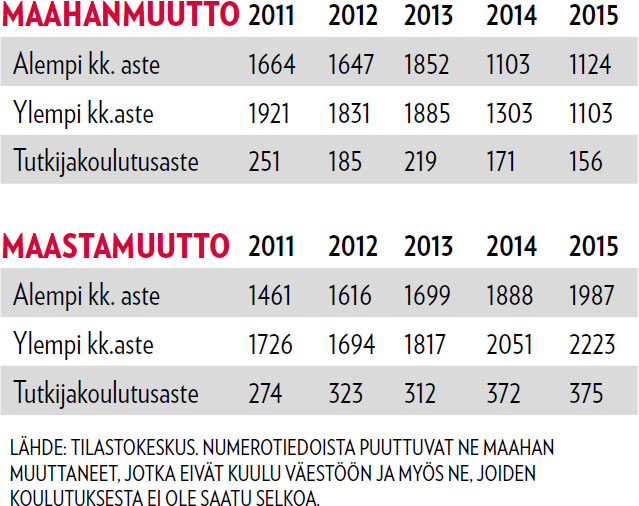 Acatiimi-lehti pyysi Tilastokeskuksesta tietoa niin sanotusta osaamisvaihtotaseesta: kuinka paljon on korkeakoulututkinnon suorittaneita maasta- ja maahanmuuttajia. Numeroiden valossa tohtoritutkinnon suorittaneiden muuttohalukkuus ulkomaille on viime vuosina kasvanut. Kaikilla korkeakoulututkinnon asteilla lähtijöitä on paljon enemmän kuin tulijoita.